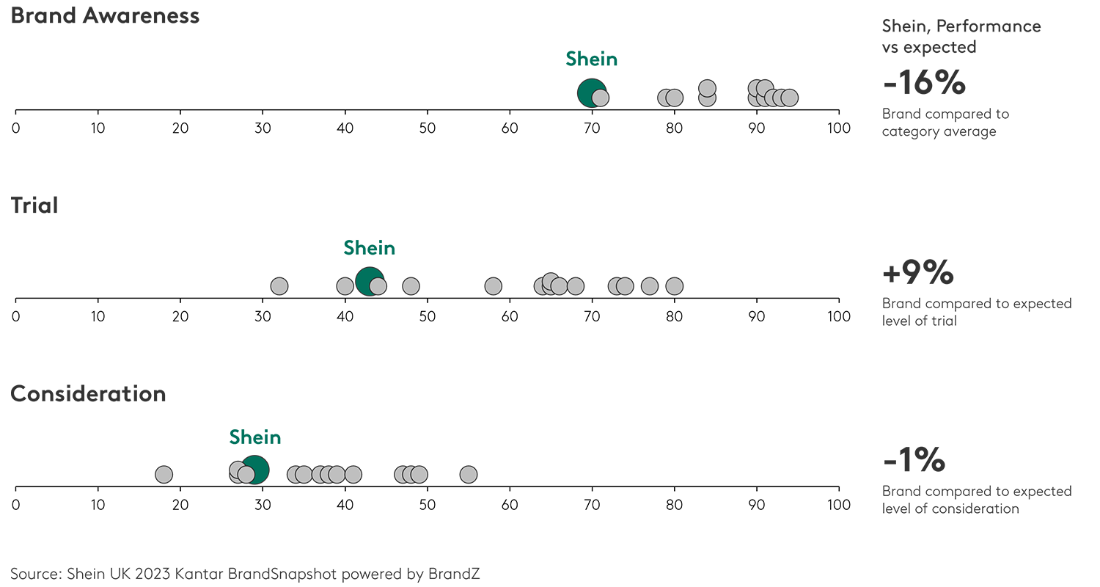 Shein skiljer sig från andra modebutiker genom att vara framförallt "Different", med ett index på 133 mot ett genomsnitt i kategorin på 100. Kanske inte överraskande för ett relativt ungt varumärke är deras nuvarande Demand Power lägre än genomsnittet i kategorin, men Future Power var över genomsnittet med ett index på 117. Detta innebär att Shein har en betydande tillväxtpotential, särskilt som konsumenternas uppfattning är att varumärket är prisvärt.