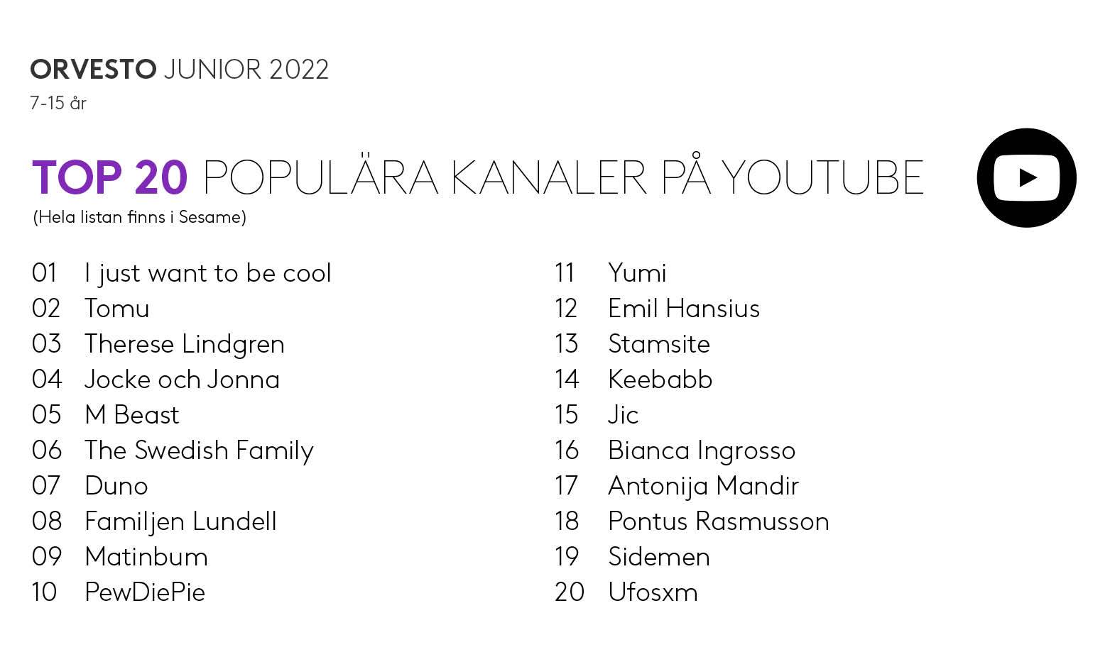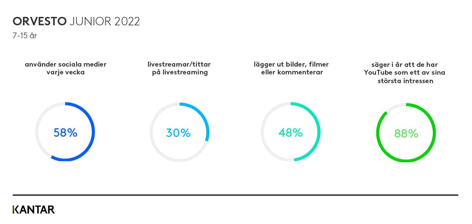ORVESTO Junior 2022 är nu lanserad. Undersökningen innehåller data och insikter om barns och ungdomars liv och deras relation till medier och digitalisering, om hur barnen konsumerar media på olika plattformar, digitala aktiviteter, tidsåtgång för mediekonsumtion, påståenden om inställning till reklam, sociala medier med mera. Nedan kan du läsa om några insikter från årets undersökning. Mer information om hur undersökningen genomförs samt nyheter i basen 2022 hittar du längre ner.