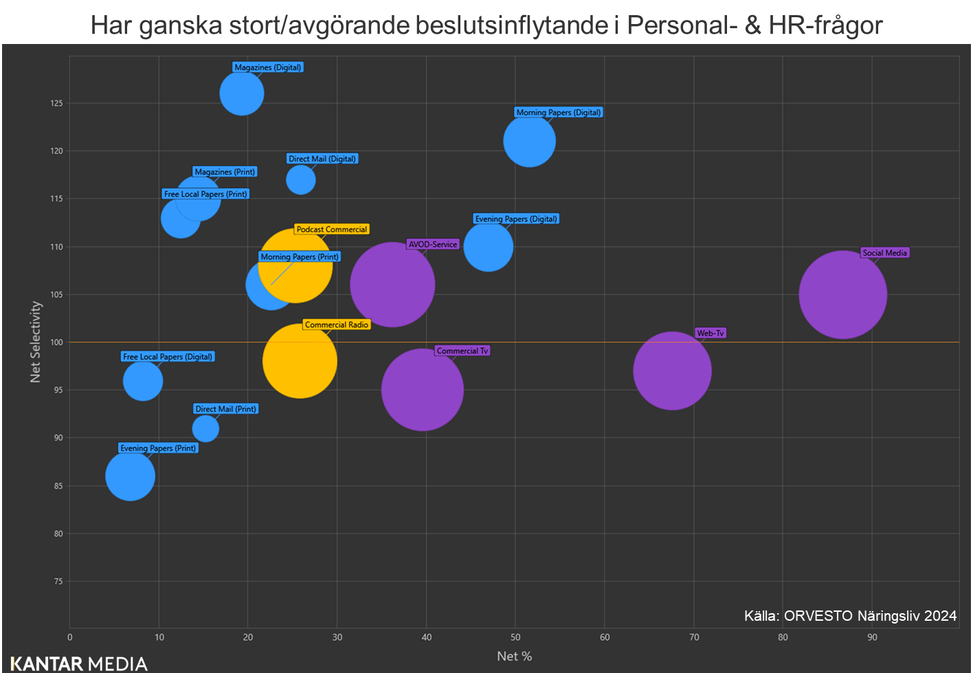 Bilden nedan visar allt detta, samtidigt som den även visar om det handlar om titta- (lila), lyssna- (gula) eller läsa (blå)-kanaler. Just i detta fall visar bilden mediebeteendet för målgruppen beslutsfattare i personalfrågor. Som referensmålgrupp här har vi yrkes-Sverige, dvs den yrkesverksamma befolkningen 21-65 år med en taxerad inkomst av förvärvsarbete på minst 100 000 kr/år.
