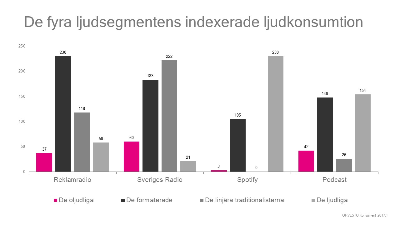 De formaterade dras till all form av formaterade sändningar. I den linjära världen konsumerar man både Public Service och de kommersiella stationerna med samma intresse. Lyssnar också gärna i efterhand och gillar de formaterade podcastsändningarna. Det enda ljud man inte omfamnat med samma entusiasm är Spotify utan där är man ungefär som svensken är mest.