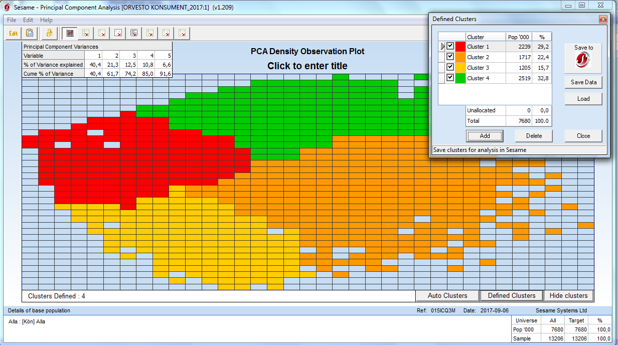 Låt mig här hoppa över beskrivningen av den statistiska analysen och bara låta er njuta av den snygga bilden som är slutresultatet av klusteranalysen. Fyra distinkt olika segment som på olika sätt beskriver det svenska lyssnandet i Sverige.