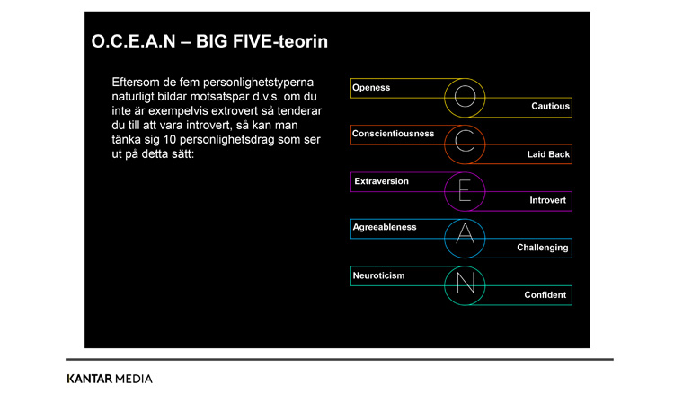 O.C.E.A.N.-modellen bidrar alltså med ytterligare en dimension för att beskriva en målgrupp och hur den fungerar, förutom alla andra variabler och modeller som finns att tillgå i SESAME.
