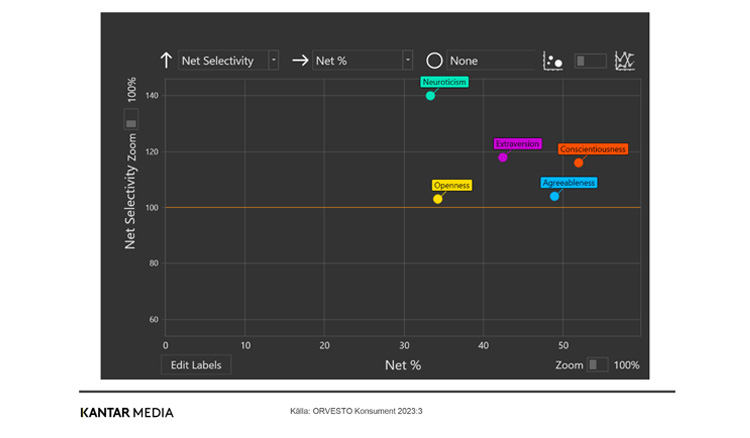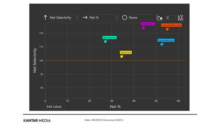 Målgruppen har även en överindexering i segmentet Extraversion (Extroversion) vilket antyder ett utåtriktat beteende. Segmentet anger graden av hur social en person är samt dennes nivå på energi och entusiasm i sociala sammanhang. Extroverta personer är vanligtvis utåtriktade, pratsamma och söker sällskap, medan introverta personer tenderar att vara mer reserverade och föredrar ensamtid eller mindre grupper av människor.