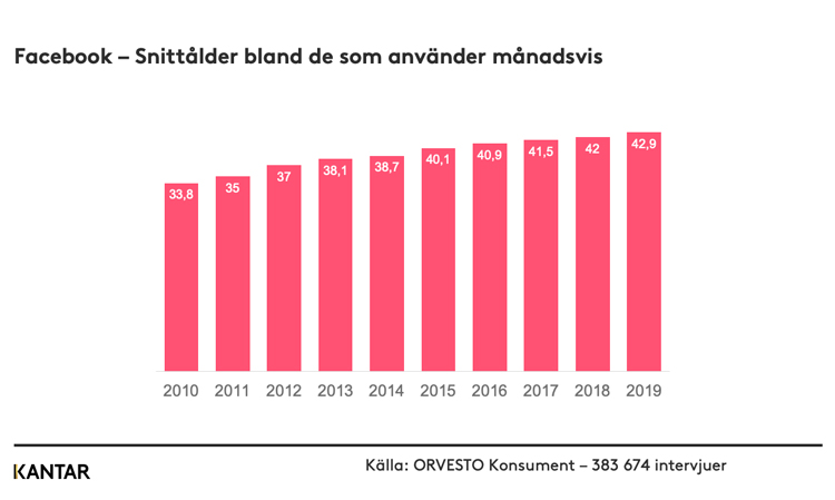 Tittar vi på svensk data så ser vi att snittåldern bland användarna ökat med ungefär ett år per år – d v s min norske kollega hade rätt. Facebook har alltså vuxit upp, eller man kanske skulle kunna säga att det vuxit med sin målgrupp då användarna nu är ungefär tio år äldre än vad de var tio år tidigare. Det finns med andra ord ett antal generationer som Facebook har ett mycket starkt grepp om.