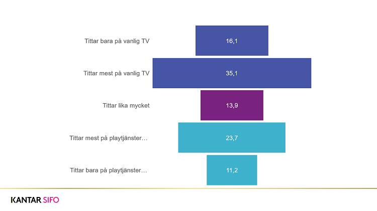 Om vi tittar på hur svenska folket beskriver sitt eget TV tittande så ser vi en bild som ser ut på detta sätt. Den procentuellt största gruppen är de som fortfarande tittar mest på vanlig TV. Den största andelen av befolkningen ”lutar” fortfarande åt vanlig linjär-TV.