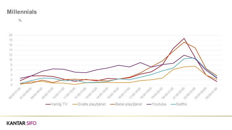 Tittar vi på data ur ORVESTO Day In Life så kan vi studera exempelvis Millennials konsumtion av rörlig bild. I detta exempel som visar en genomsnittlig dag så ser vi hur You Tube dominerar konsumtionen av rörlig bild på dagtid.
