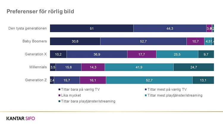 Om vi studerar hur olika generationer föredrar att ta del av rörlig bild så ser vi att det i mångt och mycket är en generationsfråga. Den stora ironin är att det är i Generation X – vilken råkar vara hemvist för drygt 50 % av de svenska marknadscheferna – som ambivalensen är mest uttalad. Om man är äldre så har man valt och man väljer linjär-TV. Om man är yngre så är man normalt mer on demand styrd.