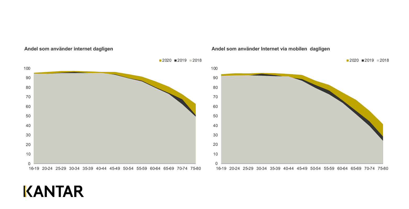 Diagram: I de allra äldsta åldersgrupperna har andelen internetanvändare ökat kraftigt under det senaste året, något som inte skulle ha skett om det inte vore för pandemin.