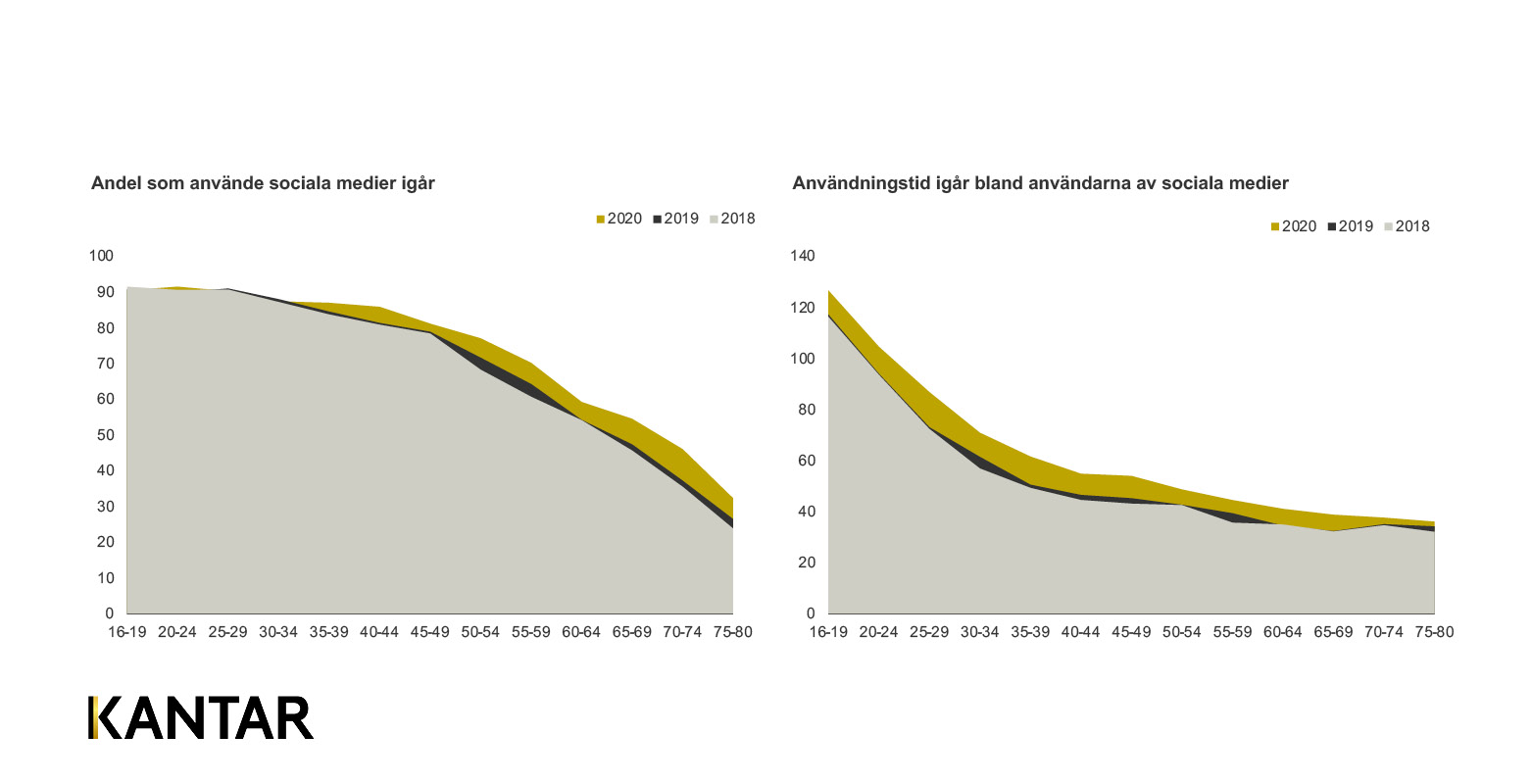 Vi ser att andelen som använder sociala medier ökat något under 2020. Det är nu knappt 75% som säger sig ha använt sociala medier i går, 2019 mätte vi upp 71%. Användningen av sociala medier ökar mest bland de äldre men inte i samma utsträckning som det generella internetanvändandet. Trots brist på livsstilsbyggandeaktiviteter ökar även tiden som användarna lägger på sociala medier. Förändringen i nedlagd tid mellan 2019 och 2018 var marginell. 2020 ser vi däremot att tiden som läggs på sociala medier tydligt har ökat i alla åldersgrupper. Detta är även det en tydlig konsekvens av ändrade livsförhållanden under Covid.