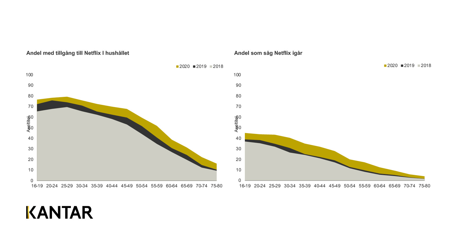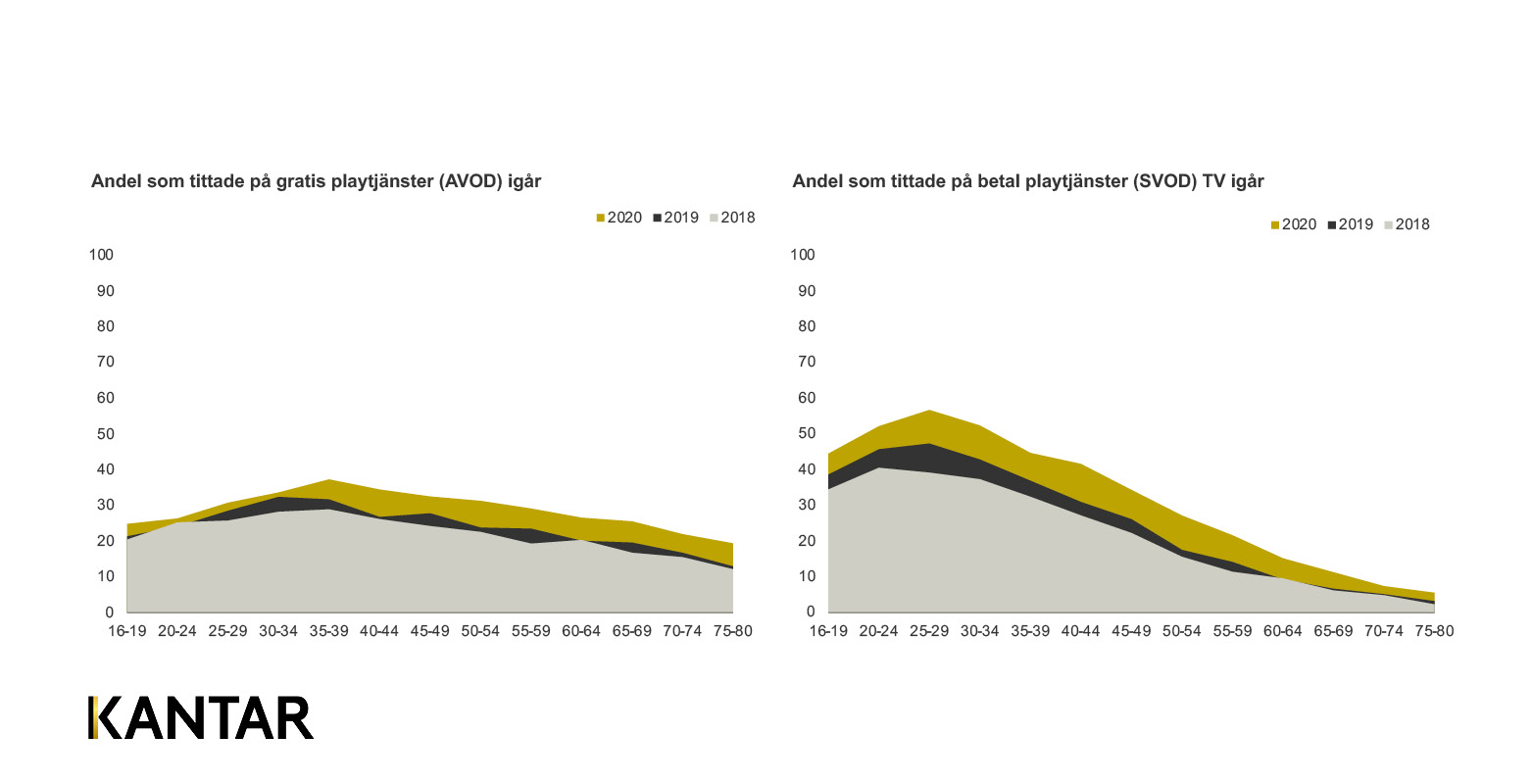 Medan utvecklingen hos de yngsta målgrupperna sannolikt är en ökning som ligger i linje med hur trenden har sett ut från tidigare år syns en tydlig covid-effekt ju högre upp i åldrarna man kommer. Det är också en skillnad i vad man väljer att titta på där en yngre målgrupp ökar på sin konsumtion av betal-playtjänster medan den äldre målgruppen i större utsträckning hittar till gratis-playtjänster. En aktör visar dock på en jämn tillströmning från alla åldrar - Netflix, som också fortsätter att plocka marknadsandelar.