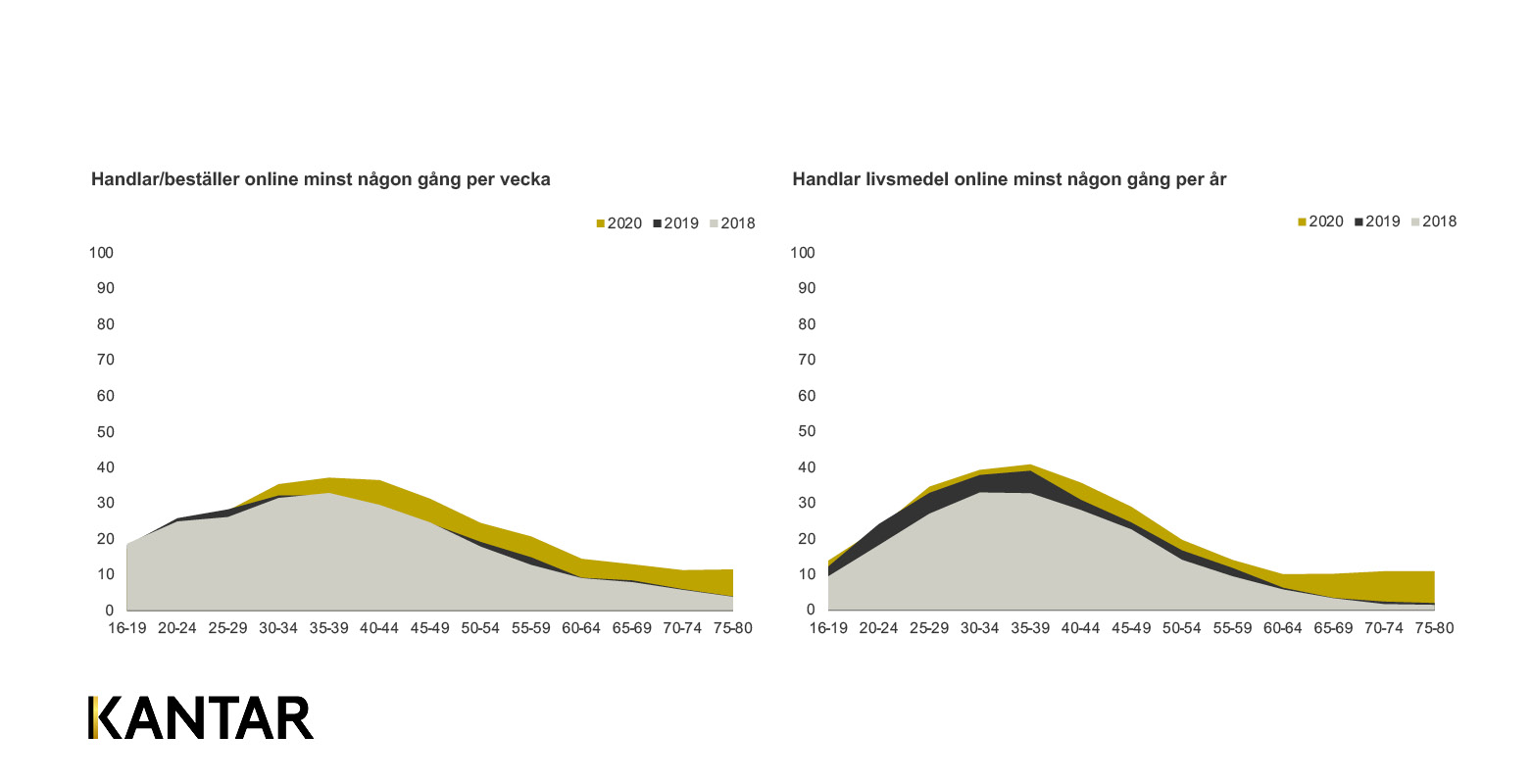 Den förändrade livssituationen i många hushåll har drivit fram nya och mer digitala konsumtionsmönster när det gäller shopping och då i synnerhet inköp av livsmedel. Detta gäller särskilt för de äldsta åldersgrupperna vilka har tvingats hitta nya sätt att handla hem mat. Vi ser också stora förändringar i näthandel av mat för dessa grupper. Andelen som har handlat livsmedel online bland de som är 70 år eller äldre är nu 11%, för ett år sedan var denna siffra endast drygt 2%. Fortfarande är det dock cirka 90% av de allra äldsta som inte handlat livsmedel online.