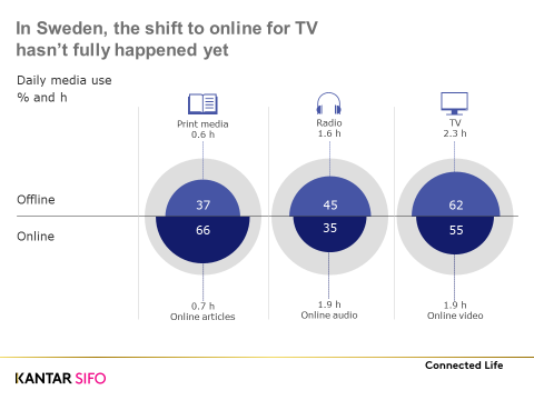 Läsa onlineartiklar, lyssna på streamat ljud och titta på streamad rörlig bild är bara några av de aktiviteter som vi kan göra på nätet. Något annat som vi ägnar vår onlinetid åt är sociala medier. Hur står de sig i onlinekonkurrensen, och vilka möjligheter och utmaningar möter varumärken där? Detta berör vi i ett kommande inlägg, om de andra fyra insikterna för Sverige. Stay connected!.