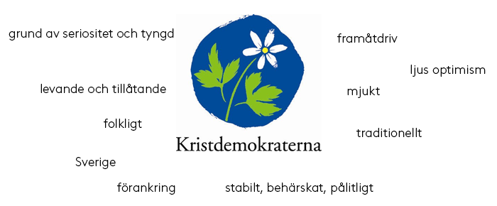 Kristdemokraternas gamla logotyp bar en organiskt rörlig form, med ojämna och varierade kantlinjer där färgen inte täcker överallt, som vore den hastigt målad. Vitsippan själv med sina spretande blad och kronblad visar på en framåtrörelse, dock något fallande. En i viss mån framåtsträvande karaktär men utan tydlig övertygelse. Typsnittet är traditionellt och standardiserat versalgement med seriffer - stabilt, behärskat och pålitligt. Färgerna är förenklade och klara, de hänvisar till Sverige och somrig natur. De bjärt gröna, gula och vita inslagen signalerar ljus optimism, den dunklare blå adderar en nypa seriositet och tyngd. Tillsammans gör de ett enkelt och folkligt uttryck. I kombination med den varierade, inexakta formen och logotypens rundhet signaleras en enkel och tillåtande karaktär som inte talar om precision och regleringar.