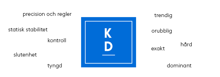 Så till den nya logotypen. Här är exakthet, precision och regleringar högst närvarande. Färgen är behärskat monokrom. Formen beräknat minimalistisk. Den exakta kvadratens geometriska form förstärks av den inre kantlinjen, tunn och petnoga, som likt en passepartout skapar marginaler till och fokus på centralgestalten KD. Ett understreck betonar detta ytterligare. Det bidrar även med extra tyngd och en stabilare bas. Bokstäverna är versala och feta - dominanta och orubbliga i den symmetriska formen. Här finns inget organiskt eller tillåtande. Här finns inte heller något uttryck för rörelse, vare sig de hastade penseldragen eller framåtrörelsen. Istället talar logotypen om makt. Om statisk stabilitet. Om att vara förankrad och sluten i sig själv snarare än i natur och nationell identitet. Eftersom formen följer en rådande formgivningstrend med sina tunna linjer och inramning finns här dock en förankring i en tid. Den är inte tidlös, så som partiet själva beskriver den.