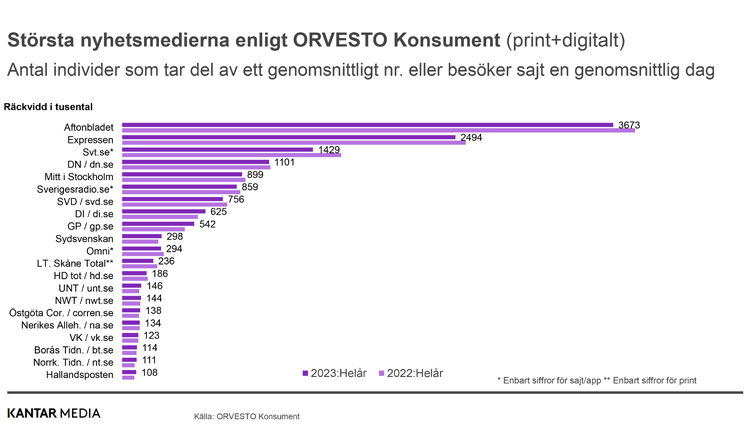 Störst totalräckvidd (netto) av de printtitlar och sajter som mäts i 2023:Helår får Aftonbladet med en medieräckvidd på 3 673 000 individer (vilket motsvarar 46% av befolkningen 16-80 år), följt av Expressen som med sina kanaler når 2 494 000 individer (31%) en genomsnittlig dag. Nedan följer de 20 största nyhetsmedierna när det gäller print och/eller digital räckvidd (mobil/desktop/app) i ORVESTO Konsument 2023:Helår.