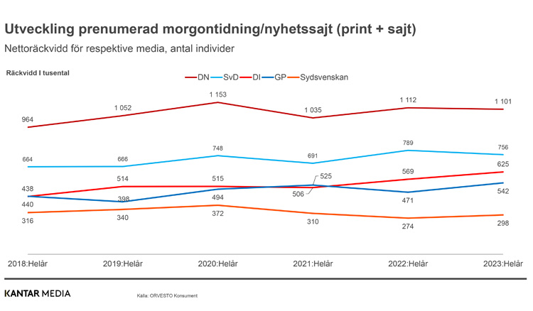 Det går även att titta på hur medierna har utvecklats över tid, som exempelvis nedan, där utvecklingen syns för några av de medier som traditionellt sett kallas prenumererad morgontidning men även i detta diagram redovisas totalräckvidder (netto) för print och sajt. Samtliga av dessa medier har haft en relativt stabil utveckling. Men det syns även en ökad räckvidd för flera av dessa exempelvis i 2020:Helår vilket sannolikt var en konsekvens av pandemin medan 2022 var ett valår.