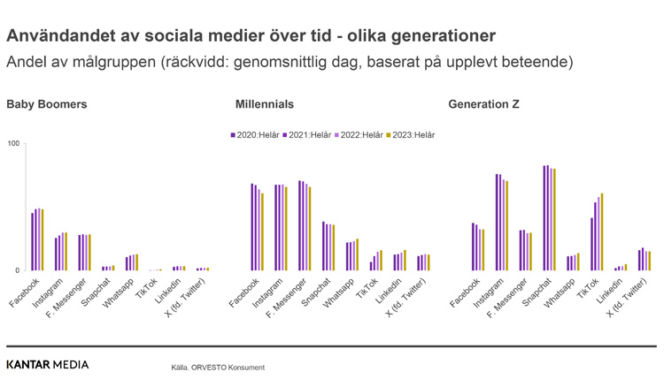 Medan den dagliga användningen för de sociala medier är relativt låg när det kommer till gruppen Baby Boomers så ser vi hos Millennials istället större andelar i de sedan länge etablerade ”större” sociala medie-kanalerna. Generation Z återfinns däremot i större utsträckning på Snapchat, YouTube och TikTok jämfört med de andra målgrupperna. Även Instagram står stark i denna målgrupp - även om det dagliga användandet visar på en viss minskning under de senaste åren.