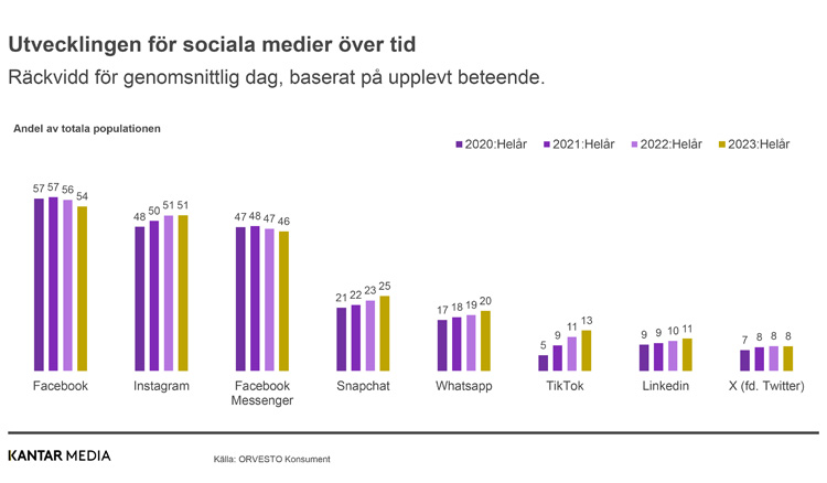 De tre sociala medieplattformar som hamnar i topp enligt ORVESTO Konsument 2023:Helår är Facebook följt av Instagram och Facebook Messenger. Sett till befolkningen har dessa tre plattformar legat i topp på relativt stabila nivåer över en längre tid. De senaste åren har dock Snapchat och TikTok utmärkt sig med en positiv utveckling – om än från låga nivåer.