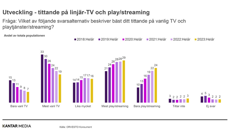 För sex år sedan var ett traditionellt TV-tittande fortfarande vanligast och 48% av populationen svarade att de ”mest eller bara” tittade på vanlig TV. Men i ORVESTO Konsument 2023:Helår svarar bara 26% av svenskarna samma sak medan 53% istället svarar att de ser mest eller bara på play-/streamingtjänster (att jämföra med 31% för sex år sedan). Störst förändring syns för tittar bara på play-/streamingtjänster. För sex år sedan svarade enbart 10% det men i 2023-års data får det svarsalternativet 24%, vilket är en ökning på 140%.