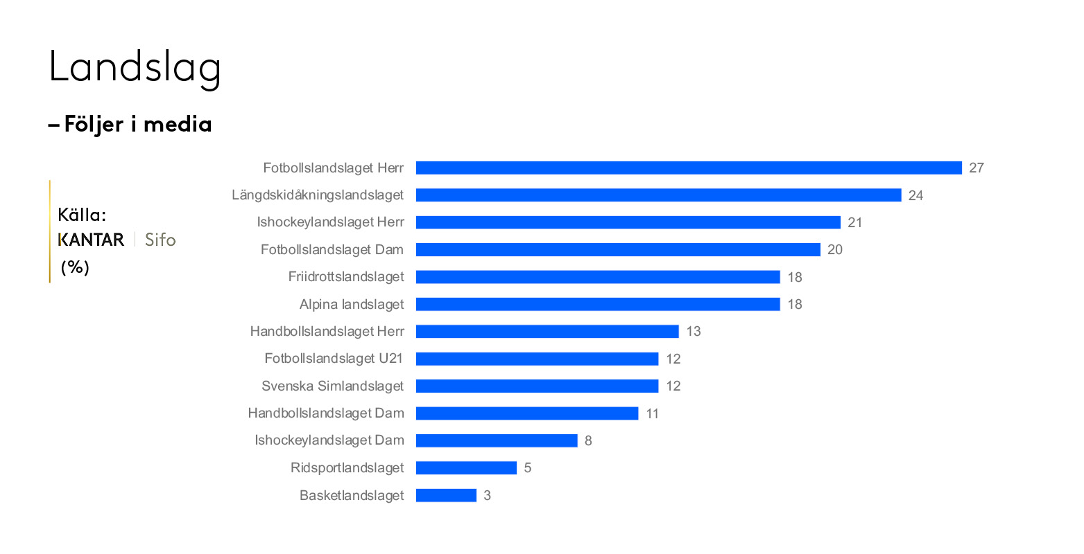 I ORVESTO Passion mäts även intresset och engagemanget runt 13 olika landslag. Här toppar fotbollslandslaget listan. 27 procent av svenskarna följer fotbollslandslaget (herr) i media, strax före längdskidåkningslandslaget på 24 procent och hockeylandslaget på 21 procent.