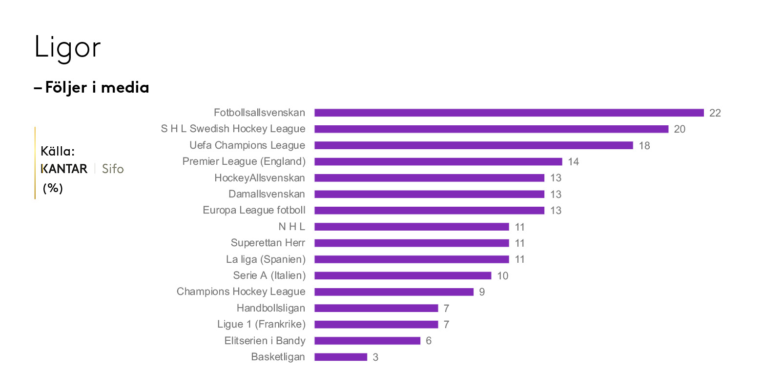 Bland de svenska och internationella ligorna som mäts är intresset störst för Fotbollsallsvenskan. 1 765 000 eller 22 procent av alla svenskar i åldrarna 16-80 år uppger att de följer Fotbollsallsvenskan i media, följt av SHL på 20 procent och Uefa Champions League på 18 procent.