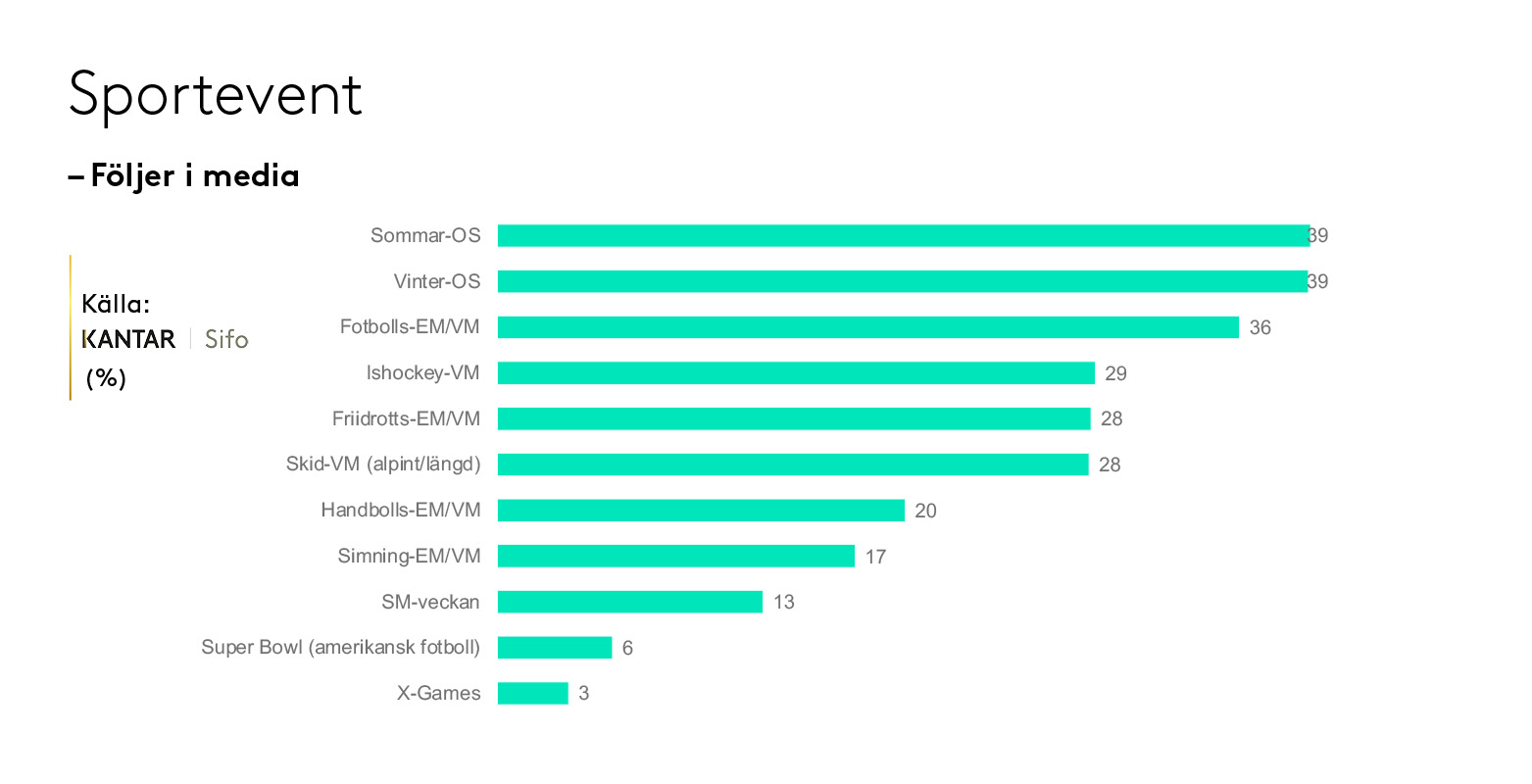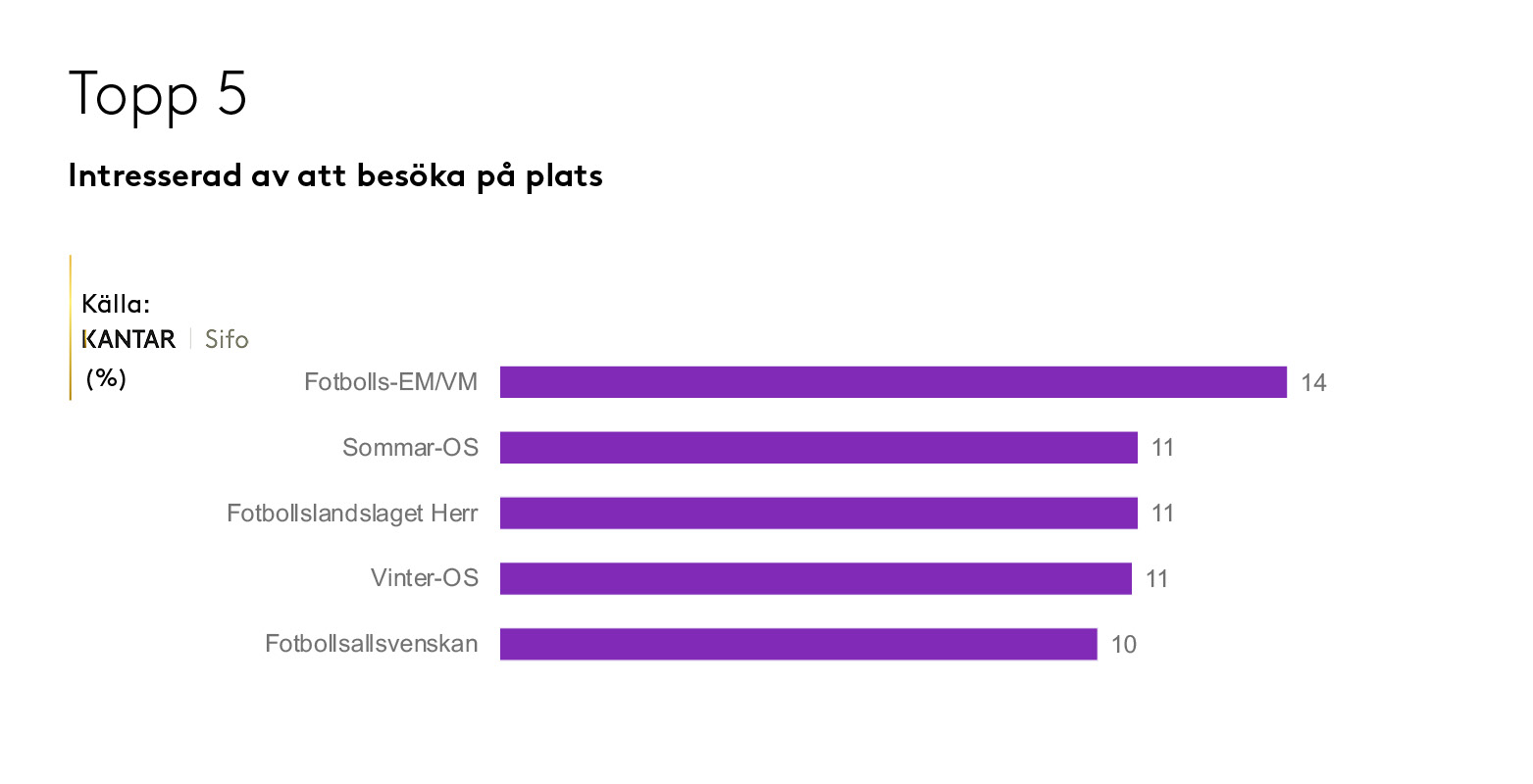 Efter Fotbolls-EM/VM kommer Sommar-OS, Vinter-OS och fotbollslandslaget som alla tre ligger på 11 procent av svenska folket.