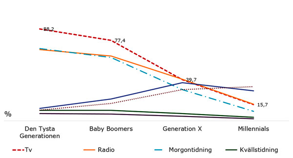 Den tysta generationen föredrar fortfarande traditionella kanaler som morgontidningar, radio och linjär TV. Här dominerar den editerade redaktionella miljön. Nyhetsinsamlingen filtreras här enbart av den selektiva perceptionen som avgör vad som når in.