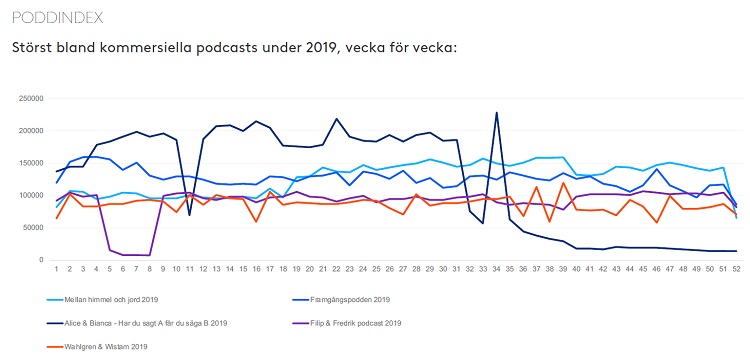 De största poddarna på Poddindex är de poddar som har störst teknisk räckvidd under året. Ett par av poddarna på Topp 5 på Poddindex ingick inte i ORVESTO Konsument-mätningen och är därför inte upptagna på listan över de tio populäraste poddarna. Men vi kan dra slutsatsen att samtliga av de största är de som också varit mest populära under det gångna året.