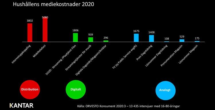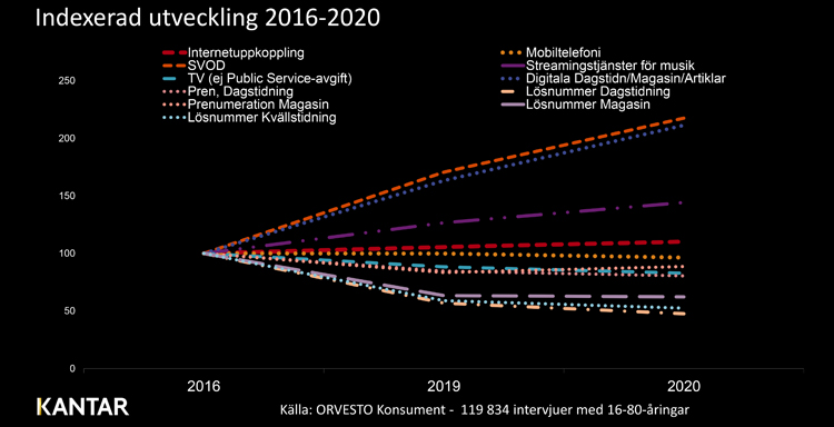 Det finns ett antal dimensioner som samverkar.Vi rör oss dels från analogt till digitalt. Dels har vi pandemin som har förändrat våra konsumtionsmönster. Detta ser vi tydligt i att de mest expanderande kostnaderna sett från 2016 är SVOD-tjänster och digitala prenumerationer för printmarknaden. Streamingtjänster för musik har per snitthushåll haft en 44 %-ig ökning sedan 2016 men vi ser nu att ökningstakten under det senaste året avtagit och det syns som om marknaden närmar sig en efterfrågeplatå.