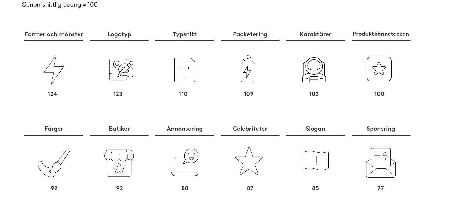 Ett exempel på värde för olika nycklar/symboler - baserat på 228 varumärken, 28 kategorier, 1390 tillgångar: