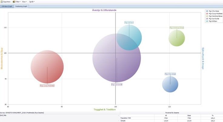 I samband med denna uppdatering har modellen fått ytterligare en grafik, en ”positionerings graf”, som komplement till den gamla grafiken. I denna graf kan olika målgruppers position jämföras i en enda bild.