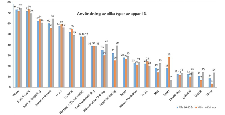 Väderappar i toppen Väderappar, bank/fi nans och navigering intar prispallen över de appar som svenska folket använder via mobilen. Män är flitiga användare av sport-appar medan kvinnor använder socialamedierappar i större utsträckning än män.
