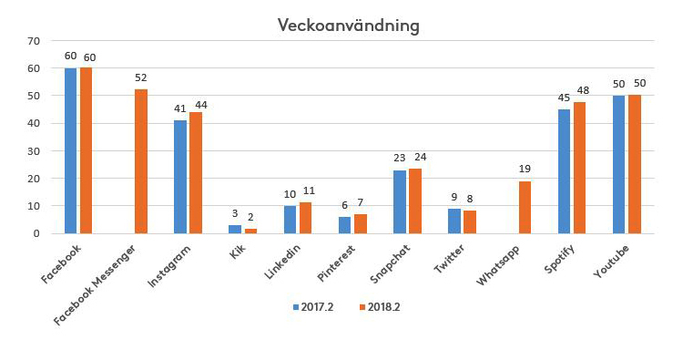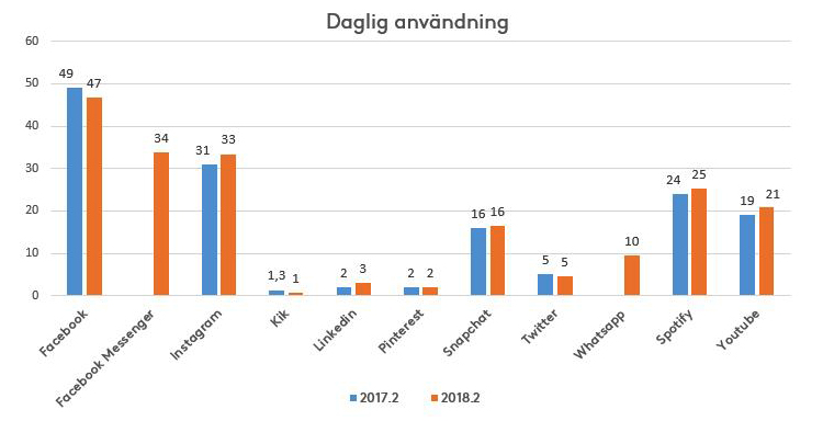 Även användningen av Youtube är oförändrat mellan mätningarna. Instagram ökar dock, från 41 % till 44 %.