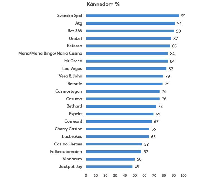 Svenska Spel har en kännedom på 95 % i målgruppen som spelar om pengar på nätet minst en gång i månaden. Bland de internationella bettingsajterna toppar Bet365 med en kännedom på 90 %.