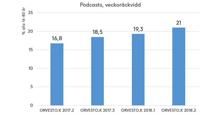 1 633 000 svenskar eller 21 % lyssnar på podcasts minst en gång per vecka. Motsvarande siffra var 1 288 000 eller 16,8 % för ett år sedan.