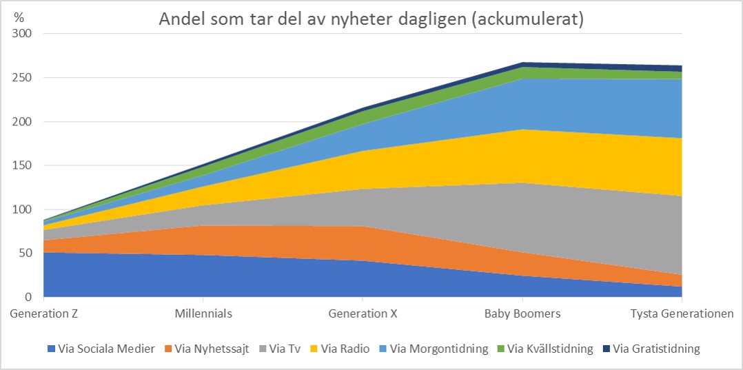 Vi ser tydliga skillnader i nyhetskonsumtionen mellan generationerna. De riktigt stora dagliga nyhetskonsumenterna hittar vi i de äldsta generationerna. Minst 60 % av de två äldsta generationerna tar del av nyheter i TV, Radio och dagstidning varje dag. Det största dagliga nyhetsmediet i de yngsta generationerna är sociala medier. Ca 50 % av generation Z och Millennials tar dagligen del av nyheter via sociala medier.