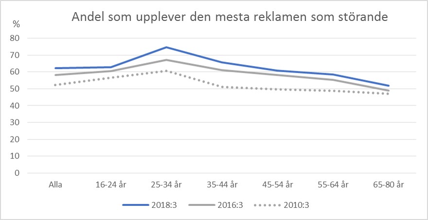 Reklamtröttheten tilltar på marknaden. Idag (2018:3) svarar 62,3 % (av alla 16-80 år) att de instämmer något eller helt och hållet i att de upplever den mesta reklamen som störande, 2010:3 var siffran 10 %-enheter lägre (52,3 %). Den åldersgrupp där reklamtröttheten är som störst är 25 till 34 åringarna där 75 % håller med i påståendet ovan, 2010 var motsvarande siffra 61 %. De ökande möjligheterna att rikta och skräddarsy reklambudskap för att öka reklamens relevans tycks inte ha slagit igenom hos mottagarna, eller så har det generella reklambruset ökat och dränker eventuell förbättrad relevans i dånet från all ointressant reklam som drar genom alla medier.