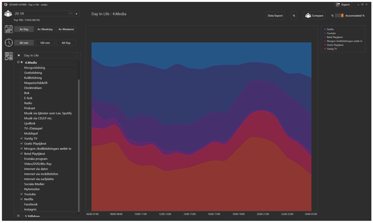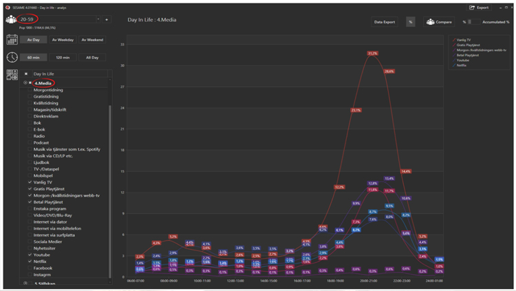 Nedanför visas mediekonsumtionen av rörligt innehåll för målgruppen 20-59 år, timme för timme en genomsnittlig dag. De nya grafiken och menyerna i Sesame gör det enkelt att analysera olika medieslag över dygnet samt att växla mellan målgrupper och olika tidsintervaller.