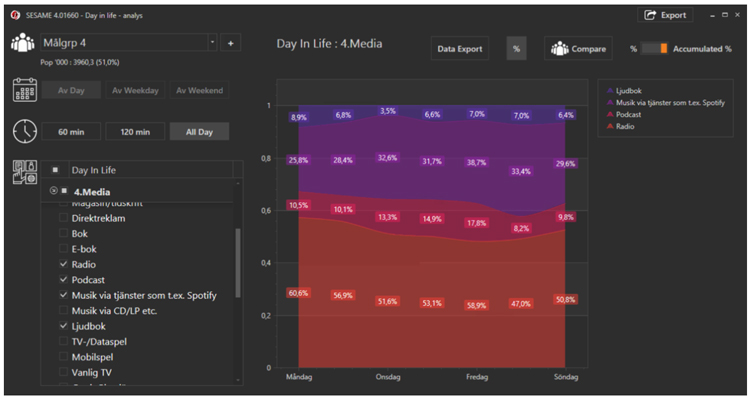 Media – Och så den kanske viktigaste delen i undersökningen. Vilka medier konsumeras vid olika tidpunkter.