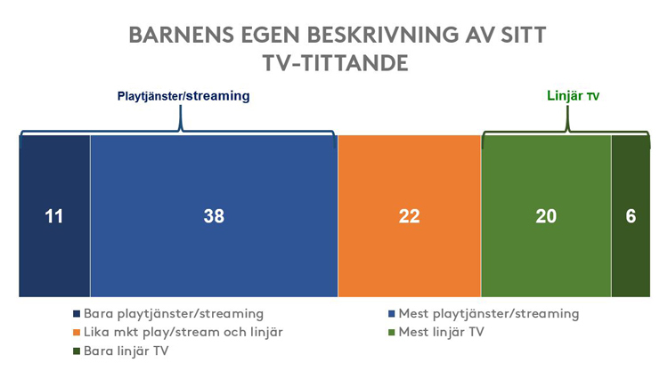 Vi har frågat barnen hur de själva skulle beskriva hur de vanligtvis tittar på TV för att få en generell översikt av barnens konsumtion av rörlig bild. De allra flesta, 38 % av barnen säger att de oftast tittar på play/streamat när de tittar på TV. 22 % anser sig titta ungefär lika mycket på play/streamat som på linjär (”vanlig”) TV. 20 % anser att de tittar mest på vanlig TV, 11 % säger att de bara tittar på play/ streamat och 6 % tittar bara på vanlig TV.