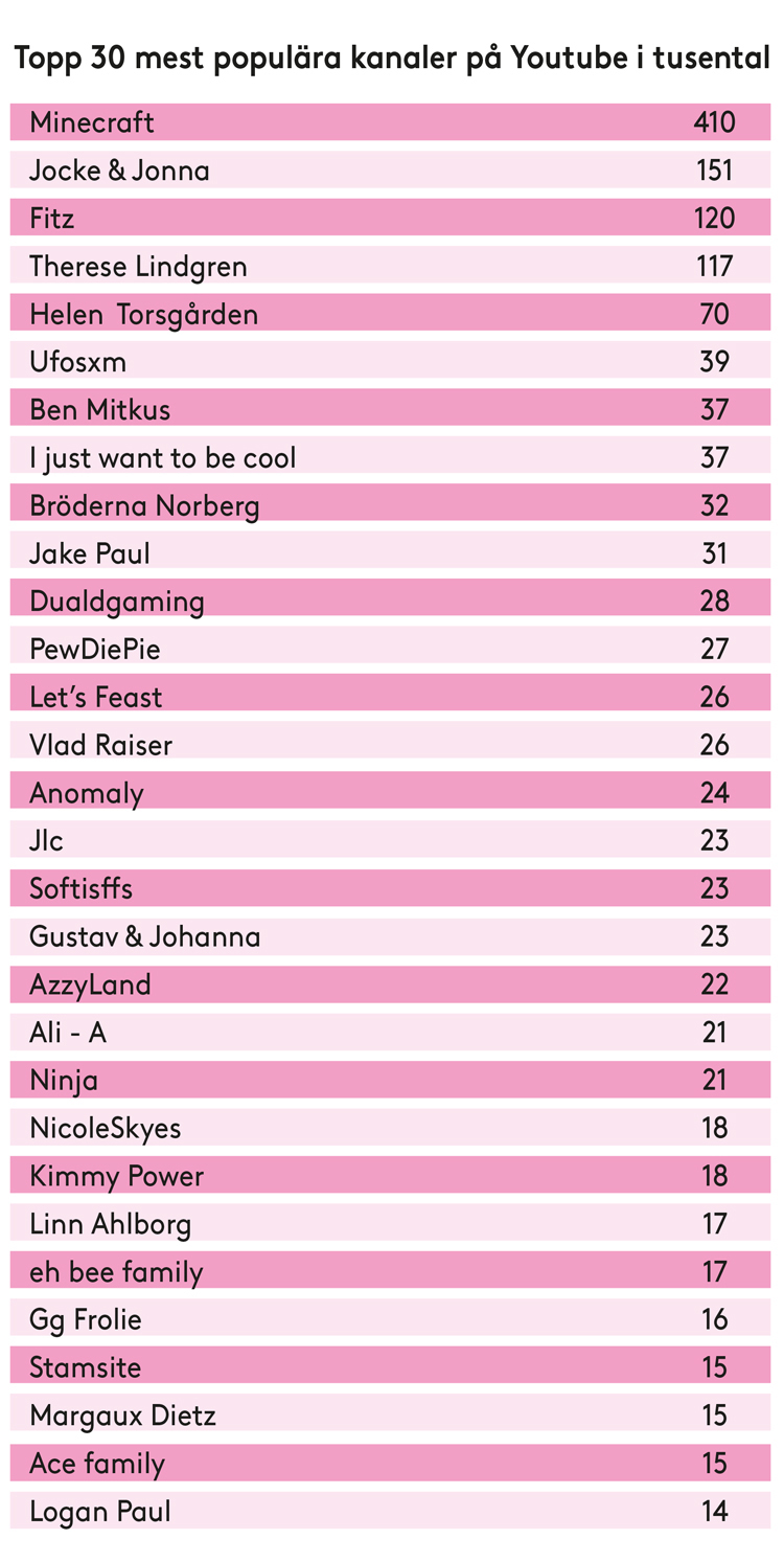 Vi har frågat vilka Youtubers barnen har som favoriter just nu. På topplistan kan vi (efter en del googlande) konstatera att majoriteten är spelkonton som Minecraft, Fitz, Ufosxm, Dualdgaming, Anomaly, Pewdiepie etc. Men vi ser även populära konton som Helen Torsgården och Therese Lindgren som vbloggar om stil, smink och livserfarenheter. Andra konton är också mer humorinriktade som Bröderna Norberg, I just want to be cool och Jocke och Jonna.