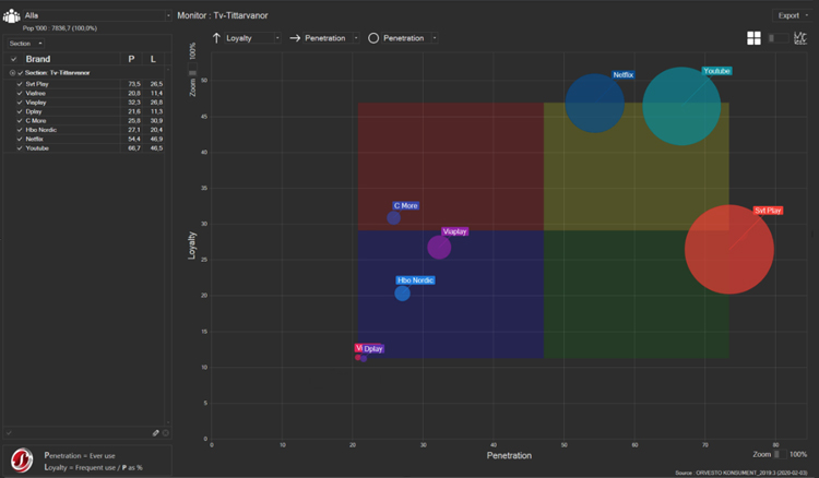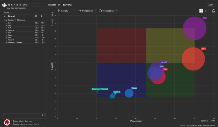 I Media Monitor kan man analysera penetration och lojalitet kopplat mot alla målgrupper i ORVESTO Konsument. Sedan tidigare har man kunnat analysera sociala medier, podcasts, dagspress, tidskrifter, digitala tjänster samt utomhus. I 2019:3 har Media Monitor utökats med även TV och radio.