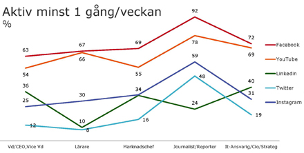Användningen av sociala medier fortsätter öka. 65% av näringslivet är aktiva på Facebook varje vecka, 32% på Instagram och 8% på Twitter enligt Orvesto Näringsliv. Marknadscheferna är mer aktiva på sociala medier än genomsnittet, men flitigast användare av sociala medier är journalister/reportrar. 92% av samtliga journalister/reportrar är aktiva på Facebook varje vecka, 59% på Instagram och 48% på Twitter.
