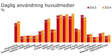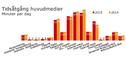 Tidskonsumtionen av internet via dator har minskat med 6 minuter per dag jämfört med mätningen 2014 och konsumtionen av internet via mobilen har ökat från 33 till 41 minuter, vilket innebär en ökning med hela 24%. Konsumtionen av Sveriges Radio har minskat med tre minuter och reklamradio är oförändrat jämfört med Orvesto Näringsliv 2014.