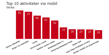 Veckovis är de vanligaste aktiviteterna på samtliga plattformar (förutom att skicka SMS/MMS, surfa, läsa e-post och ringa samtal) att besöka sociala medier (61,5%), titta på webbklipp/webb tv (50%), läsa dags-/kvällstidning (41,8%) och streama musik (35,5%).