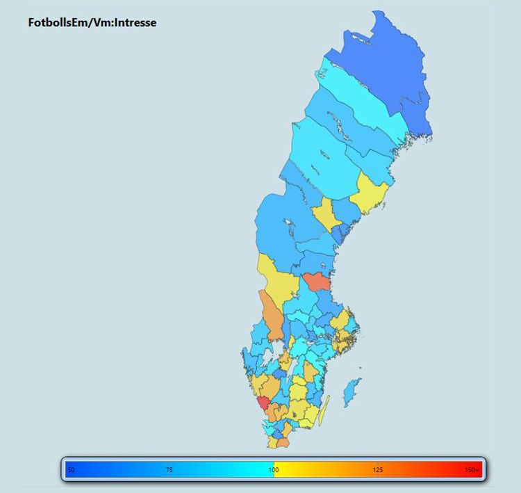 Med den fantastiska fotbollssommaren där det svenska herrlandslaget har briljerat i VM blir jag lite förvånad när jag ser att ”bara” drygt var fjärde svensk säger sig varar intresserad av fotbolls-EM/VM. I somras kändes det som alla var det! Det kanske beror på att intresset för evenemanget är faktiskt lite större här i Stockholms län än i riket i snitt. Tittar vi på hur det ser ut i Sverige ser vi att intresset för fotbolls-EM/VM är mest överrepresenterat i A-regionerna Falkenberg/Varberg, Bollnäs/Söderhamn, Ystad/Simrishamn, Karlstad resp. Halmstad. Svalast intresse finns i Haparanda/Kalix och Kiruna/Gällivare.
