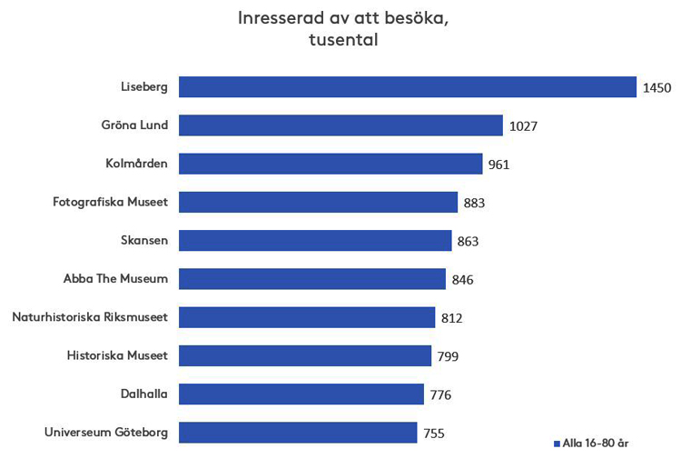 Om vi tittar på framtidsplanerna, är det åter Liseberg som toppar listan över de platser som man är intresserad av att besöka. Både män och kvinnor sätter Göteborgstivolit på första platsen, likaså svenskarna mellan 16-49 år.