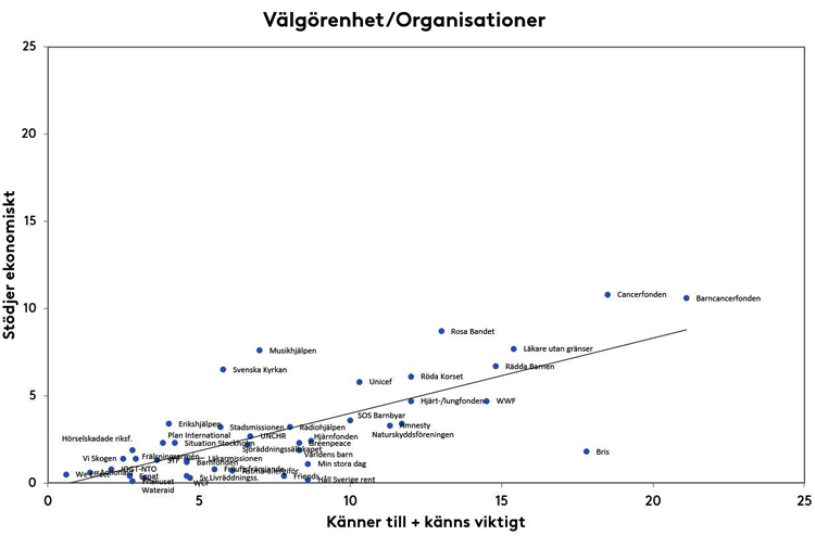 Välgörenhet är också något som engagerar oss. I ORVESTO Passion, för hela 44 olika organisationer – från Actionaid till Världsnaturfonden WWF frågar vi om man känner till organisationen, om man tycker att den känns viktig, om man är aktiv/medlem i resp. om man stödjer ekonomiskt.