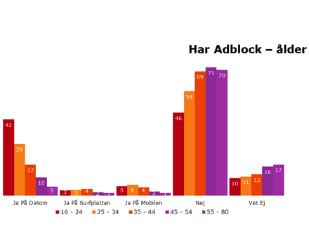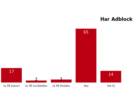 Ad-block installerat på surfplattan och i mobilen är fortfarande inte så vanligt. Endast 2,3% har installerat ad-block på surfplattan och 3,4% i mobilen. I åldersgruppen 16-24 år har 42% installerat Ad-block på sin dator.