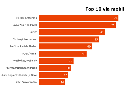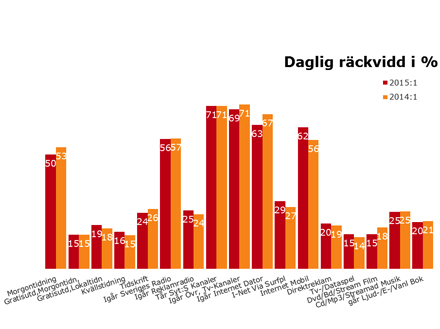 Läsning av morgontidning fortsätter att minska. Totalt sett minskade läsning av morgontidning från 53% till 50%. I åldersgruppen 16-24 år ligger morgontidningsläsningen på 19% jämfört med 23% i mätningen 2014:1. Daglig räckvidd för internet via mobilen fortsätter öka och är nu uppe i 62% i hela riket, strax under daglig räckvidd för internet via dator som ligger på 63%. Den dagliga räckvidden för internet via surfplatta är 29%.